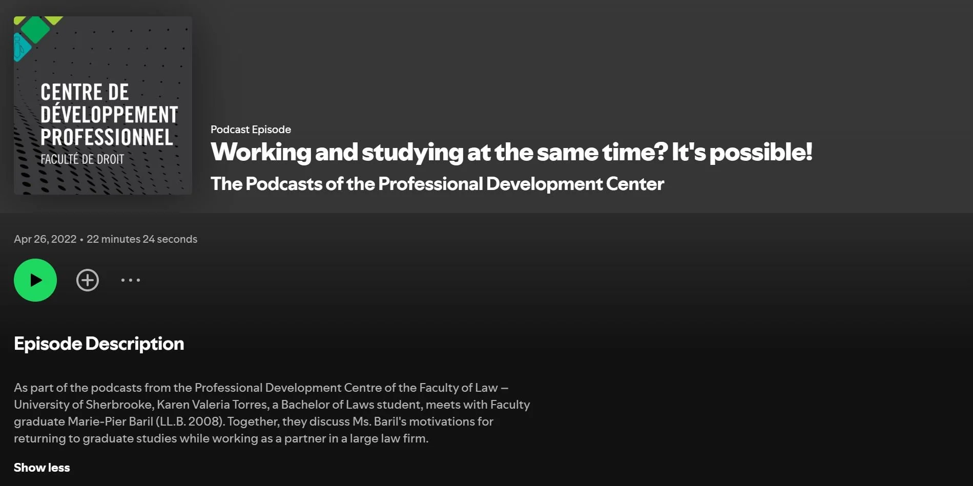 Source : CENTRE DE DÉVELOPPEMENT PROFESSIONNEL, “Travail et études supérieures en simultané? C’est possible”, University of Sherbrooke, April 26th, 2022, online : ‹https://open.spotify.com/episode/0Wf98fbxZrv00BFr37nEyl›. Original in French. English version provided by Google Chrome Browser.