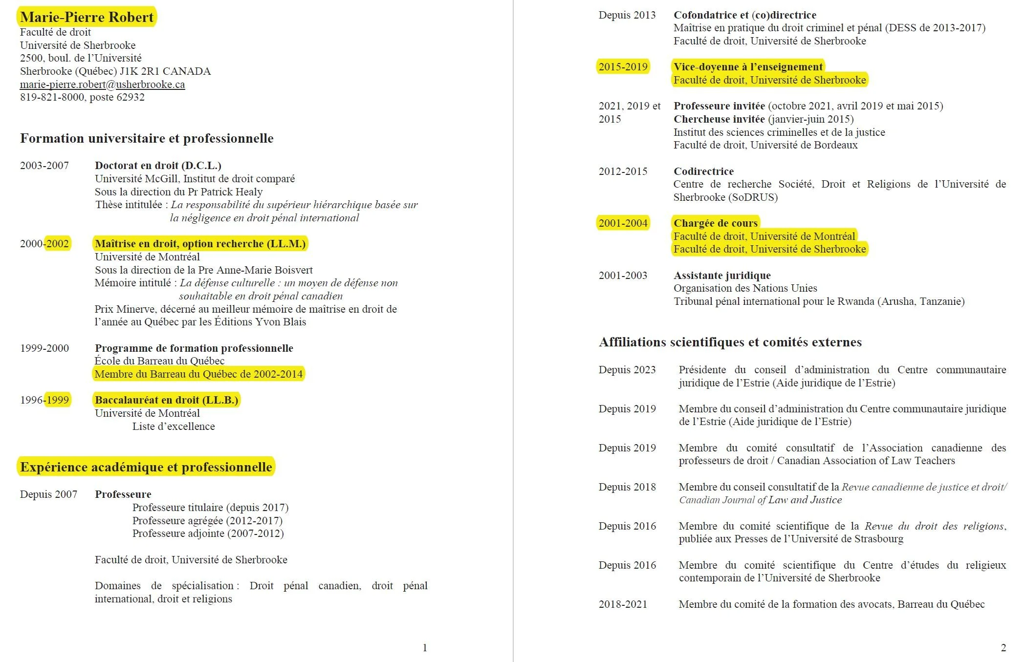 Note : En 2001, selon ce même CV, Marie-Pierre Robert prétend avoir été en même temps en Tanzanie (1. assistante juridique aux Nations Unies) et au Québec (2. étudiante à la maîtrise et 3. chargée de cours)… activités exercées toutes à temps plein… à une époque où la technologie ne permettait pas le travail à distance.
